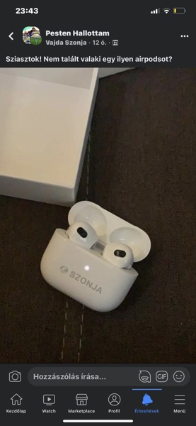 Fehér színű Apple airpods rágravírozva a nevem, hogy vajdaszonja@gmail.com 06302903016